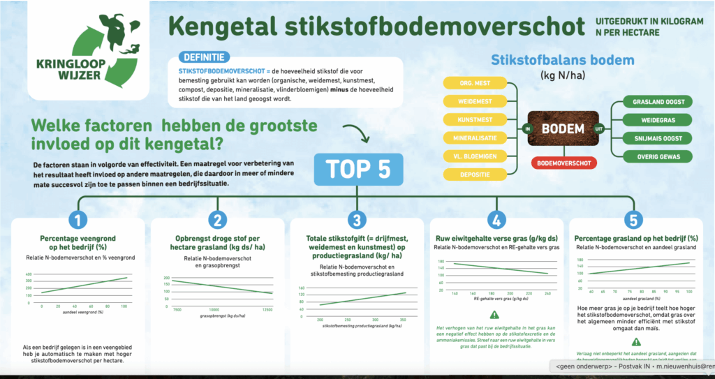 Welke factoren hebben de grootste invloed op de kengetallen ‘eiwit van eigen land’, ‘stikstofbodemoverschot’, ‘broeikasgassen’ en ‘ammoniakemissie’? In een studie, gebaseerd op ruim 34.000 records uit de KringloopWijzer over de jaren 2016, 2017 en 2018, zijn statistische analyses toegepast om verbanden te ontdekken tussen bedrijfskenmerken, managementkeuzes en duurzaamheidspresentaties. De eindconclusies van dit onderzoeksrapport zijn samengevat in vier factsheets (maart 2021).