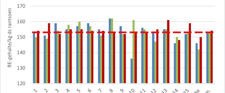 In figuur 1 zijn de RE-gehaltes van de Koeien & Kansen-bedrijven voor 2021, 2022 en 2023 weergegeven. Deze figuur laat zien dat het gemiddelde RE-gehalte van de Koeien & Kansen-bedrijven in 2023 uitkomt op ongeveer 154 gram RE/kg ds. Dit gehalte wijkt nauwelijks af van het gemiddelde van voorgaande jaren.
