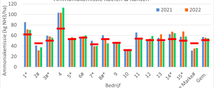 De ammoniakemissie op de Koeien en Kansen-bedrijven in 2023 bedroeg gemiddeld 55 kg NH3/ha, wat 1 kg NH3/ha lager was dan in 2022. De reductie kwam voornamelijk door een verminderde toediening van drijfmest. Het aangescherpte doel voor 2023 werd gemiddeld net niet gehaald.