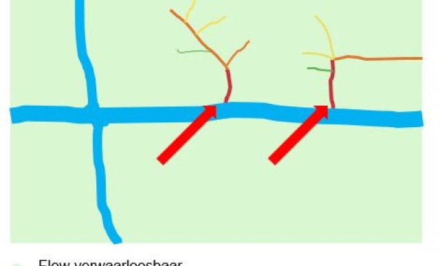 Figuur 2: Uitsnede van een afspoelkaart uit de BWW. De flow (stroom) uit de legenda geeft aan hoeveel oppervlak afwatert op het betreffende punt; hoe donkerder, hoe groter het oppervlak. Als zo’n donkere plek vlak naast de sloot ligt, zoals in de rode pijlen aangeven, is het risico op afspoeling dus groot.
