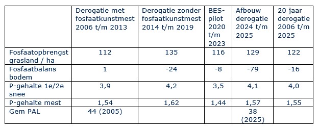 De negatieve fosfaatbalans van gemiddeld -16 kg fosfaat per ha per jaar in 20 jaar derogatie is zichtbaar in de afname van de fosfaattoestand van de bodem. De PAL-waarde is gedaald met 6 punten. Om de verdere daling af te remmen of volledig te keren zal fosfaatkunstmest moeten worden ingezet. Ook gezien het feit dat de lagere P-gehalte in de 1e en 2e snee in de laatste jaren vaker voorkomt. En dat is nu ook weer mogelijk, omdat er geen derogatie meer is.