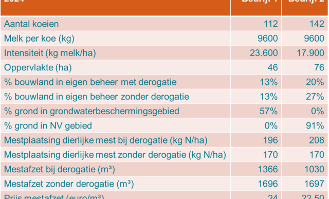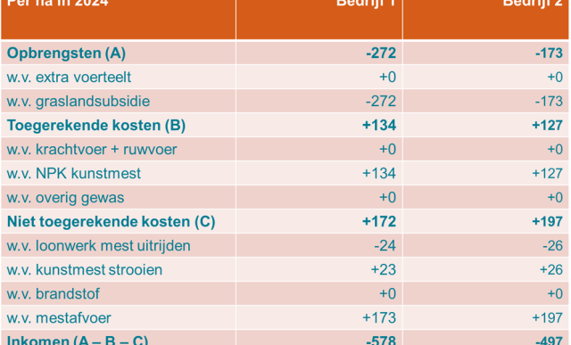• De graslandsubsidie, die bij derogatie kan worden aangevraagd, vervalt op beide bedrijven wanneer geen gebruik wordt gemaakt van derogatie. Op bedrijf 1 is de graslandsubsidie per hectare hoger dan op bedrijf 2, omdat op de mestplaatsingsruimte in 2024 lager was dan op bedrijf 2. Dit berdrag kan worden beschouwd als compensatie van verlaging gebruiksnormven 2024 ten opzichte van gebruiksnorm van 250 kg N per hectare die nog in 2022 gold.