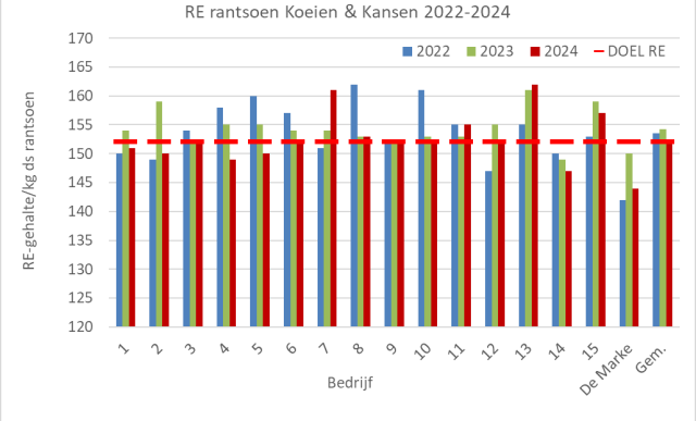 Koeien & Kansen heeft met de deelnemers afgesproken om een nog scherpe doel na te streven. In 2022 en daarvoor was dit maximaal 155 gram RE/ kg ds en in 2023 was het doel 153 gram RE/kg ds. In 2024 is het doel verder aangescherpt naar maximaal 152 gram RE/kg ds.