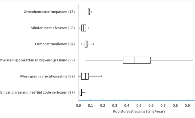 De gemiddelde extra koolstofvastlegging van maatregelen varieerde van 0,025 tot 0,47 ton koolstof per ha per jaar (Figuur 1). Het omzetten van vruchtwisselingen van tijdelijk grasland en bouwland naar blijvend grasland was verreweg de beste maatregel om de koolstofvoorraad in de bodem te verhogen, tot bijna één ton koolstof per ha per jaar. Alle andere maatregelen hadden een relatief laag effect, variërend van 0 tot 0,2 ton koolstof per ha per jaar.