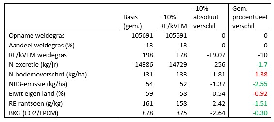 Een daling van 10% in RE/kVEM in weidegras leidt gemiddeld tot slechts 0,3 tot 2,6% verschil in diverse duurzaamheidsparameters. Enkele resultaten uit de analyse op een rij: