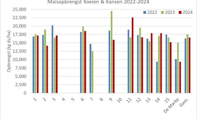 Figuur 3: Netto maisopbrengst (kg ds / ha) op 16 Koeien & Kansen-bedrijven (incl. De Marke) in 2022-2024.