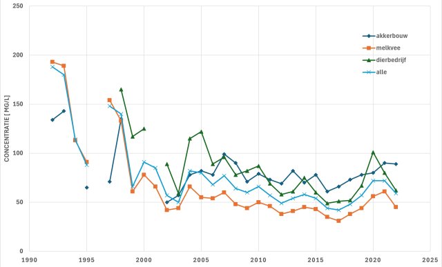 Laten we starten met de harde cijfers van de meest kwetsbare grond: zand. Het is onmiskenbaar dat de waterkwaliteit in de melkveehouderij in droge jaren 2020 en 2021 boven de 50 mg gestegen is gestegen. In de 10 jaar daarvoor werd de 50 mg wel gemiddeld behaald. Het negatieve effect van droogte is ook zichtbaar in de laatste nitraatrapportage van 2024. In 2022 en 2023 is het nitraatgehalte weer gedaald ten opzichte van 2021. Het is duidelijk dat melkveehouderij met grasland goed is voor een goede waterkwaliteit. Met deze resultaten kunnen we de dialoog aangaan.