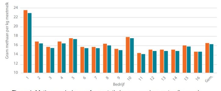 Voor de 16 Koeien & Kansen bedrijven is het effect van de aanpassing doorgerekend met de rantsoenen van 2023. In figuur 1 staan de resultaten. Gemiddeld daalt de methaanemissie door pensfermentatie van 16,3 naar 16,1 gram methaan per kg meetmelk (1%) bij een gemiddelde vers-grasopname van 890 kg droge stof per koe per jaar. Op bedrijf 1 vreten de koeien 3.100 kg droge stof weidegras per koe per jaar. Op dit bedrijf daalt de methaanemissie van 23,8 naar 22,9 gram methaan per kg meetmelk. Dit geeft 4% daling van de methaanemissie. Op bedrijf 13 is de weidegrasopname maar 370 kg droge stof per koe per jaar en daar daalt de methaanemissie maar 0,5%. Omdat bedrijf 16 geen beweiding of zomerstalvoedering toepast, is er geen verandering van de methaanemissie. Gemiddeld over de Koeien & Kansen-bedrijven is het effect van de aanpassing dus beperkt (-1%).