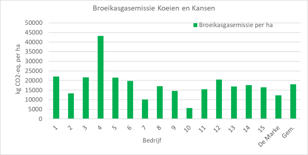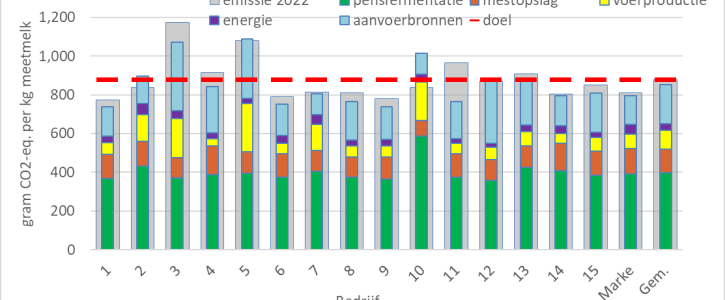Opvallend in figuur 1 is dat er grote verschillen zijn tussen de bedrijven. Veel bedrijven hebben een uitstoot van 800 tot 900 gram CO2-eq. per kg meetmelk, maar drie bedrijven (3, 5 en 10) hebben een aanzienlijke hogere uitstoot. De bedrijven 3 en 5 hebben te maken met een hoge lachgasemissie door omzetting van veengrond. Dit leidt tot een hoge broeikasgasemissie bij de productie van voer. Beide bedrijven hebben ook een hogere emissie uit aangevoerde producten. Door de afwezigheid van jongvee (bedrijf 5) of gezondheidsproblemen (bedrijf 3) voerden beide bedrijven meer dieren aan dan gemiddeld. Daarnaast was de aanvoer van krachtvoer bij beide bedrijven hoger dan gemiddeld bij de andere bedrjjven.