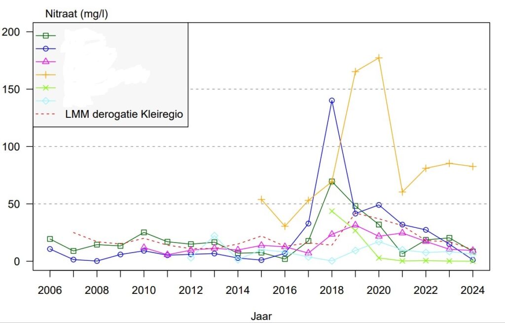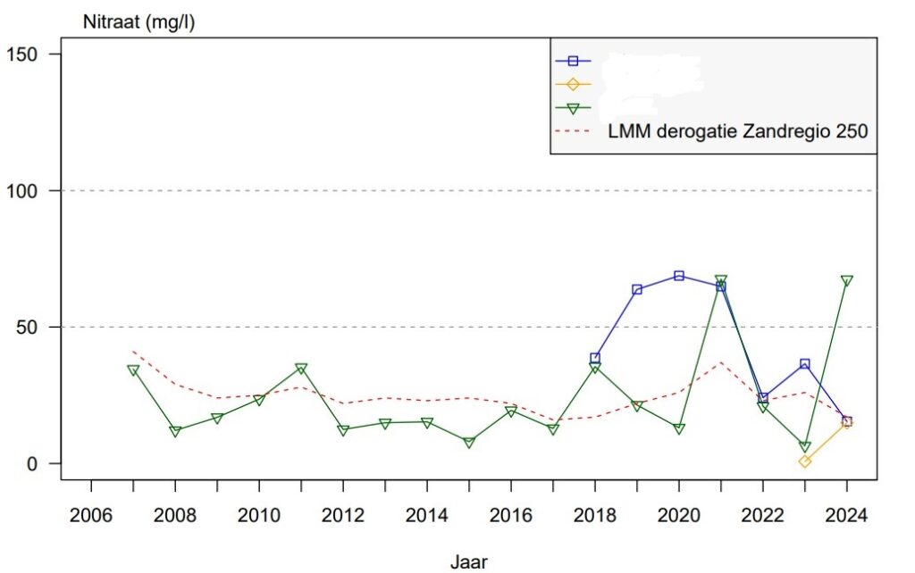 - Zand midden: De waarden liggen in 2024 duidelijk onder de norm van 50 mg/l nitraat.