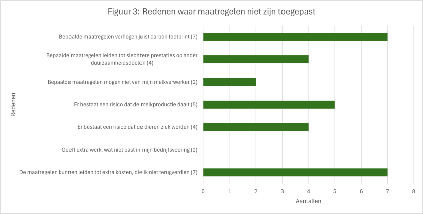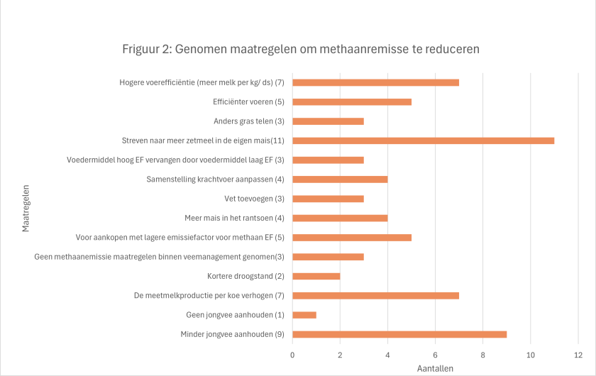 Hieruit blijkt dat bedrijven zich in eerste instantie richten op managementmaatregelen, zoals het verminderen van het aantal jongvee dat gehouden wordt en het verhogen van (meet)melkproductie. Deze aspecten hebben invloed op de methaanemissie per kg meetmelk.