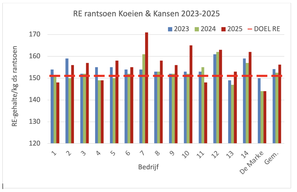 In 2025 was het gemiddelde RE-gehalte in het rantsoen van de Koeien & Kansen-bedrijven 156 gram RE per kg droge stof (ds). Dit was 4 gram hoger dan in 2024. Door deze stijging werd het aangescherpte projectdoel van 151 gram RE/kg ds in 2025 niet gehaald.