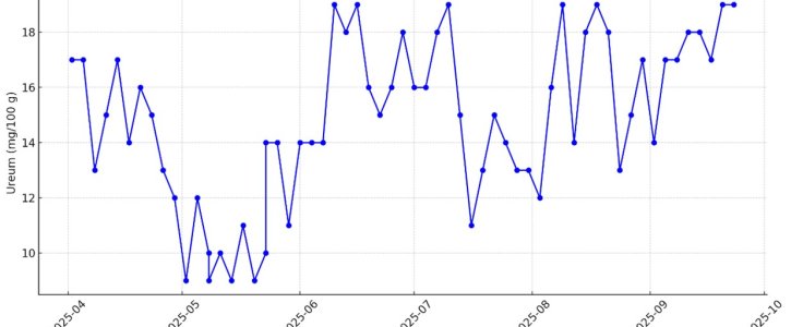 Wel werd een duidelijke daling in vetgehalte waargenomen. Van een percentage van 4,70% in het voorjaar naar onder de 4,20% in de tweede helft van juni. Het eiwitgehalte bleef relatief stabiel rond 3,60–3,80%. Door nauwkeurig te sturen met krachtvoer is het ureumgehalte in de melk vrij constant gebleven (zie figuur 1). In het voorjaar werd daarnaast minder mais verstrekt, terwijl in de zomermaanden 13 kg mais per koe per dag is toegevoegd om de energiebalans en structuur in het rantsoen te borgen. In figuur 3 is weergegeven hoeveel kg droge stof er gevoerd is per voersoort in de periode van april t/m september.