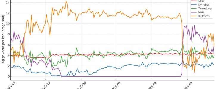 In april en mei werd gemiddeld 15 kg krachtvoer per 100 kg melk verstrekt. In juni en juli steeg dit naar 20 kg en in augustus naar 22 kg. De melkproductie bleef daarbij stabiel op 33 liter per koe, met een lichte stijging ten opzichte van voorgaande jaren.